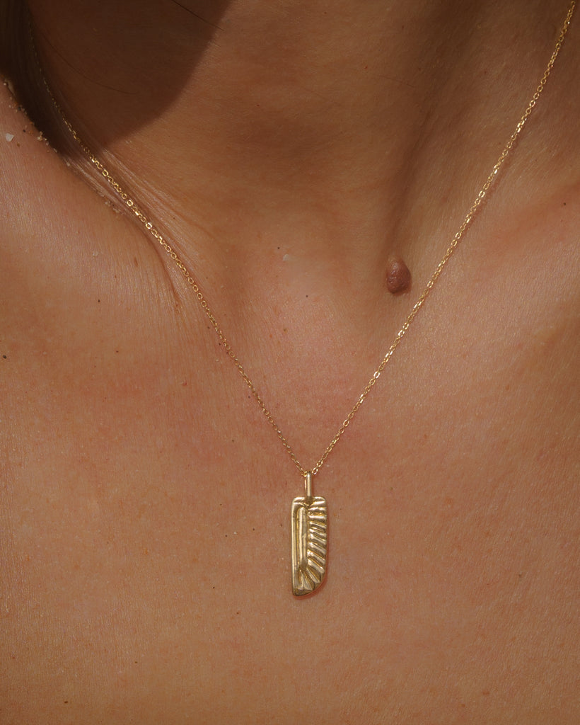 Each piece is hand-carved in wax by Laura using traditional files, then cast in 14k gold in Los Angeles through the ancient lost-wax method. This process preserves the organic texture of the carving, giving the pendant the feeling of a relic carried across landscapes.